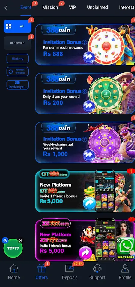 Login rewards and promotions help users earn extra income.