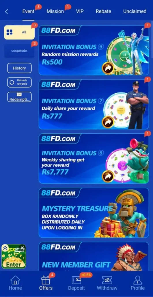In 88FD App you are not only earning through betting, it gives you other options of earning like login bonuses, and referral system. Both these systems are very great chance to earn huge amounts. You can earn 600 on every invitation.